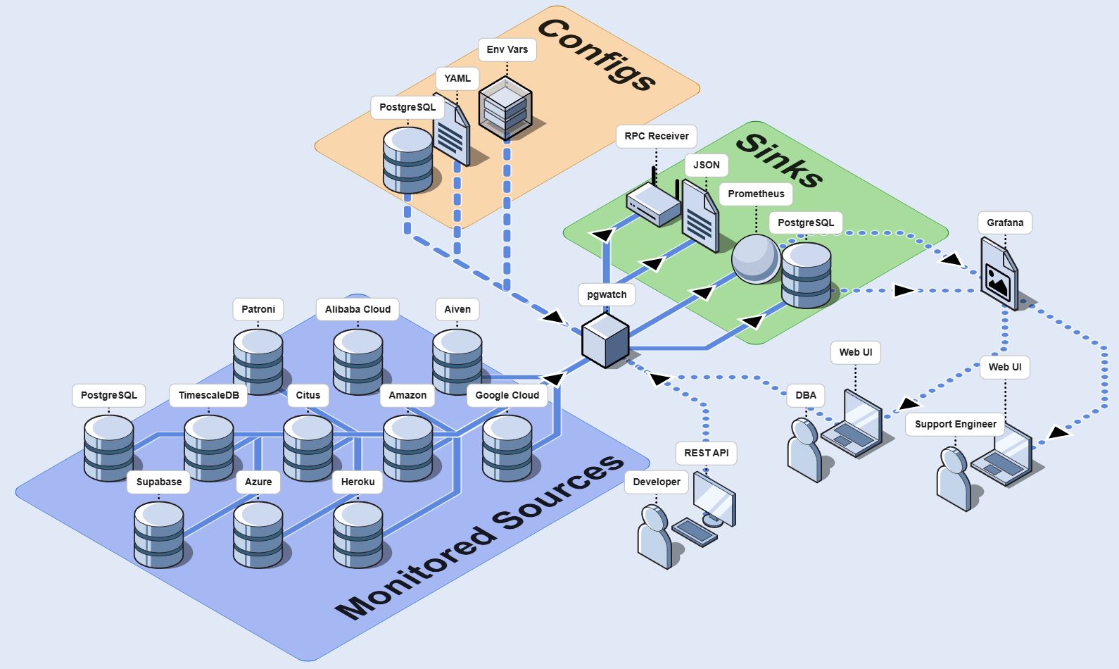 The main development idea around pgwatch was to do the minimal work needed and not to reinvent the wheel - meaning that pgwatch is mostly just about gluing together already some proven pieces of software for metrics storage and using Grafana for dashboarding. So here is a listing of components that can be used to build up a monitoring setup around the pgwatch metrics collector. Note that most components are not mandatory and for tasks like metrics storage there are many components to choose from.